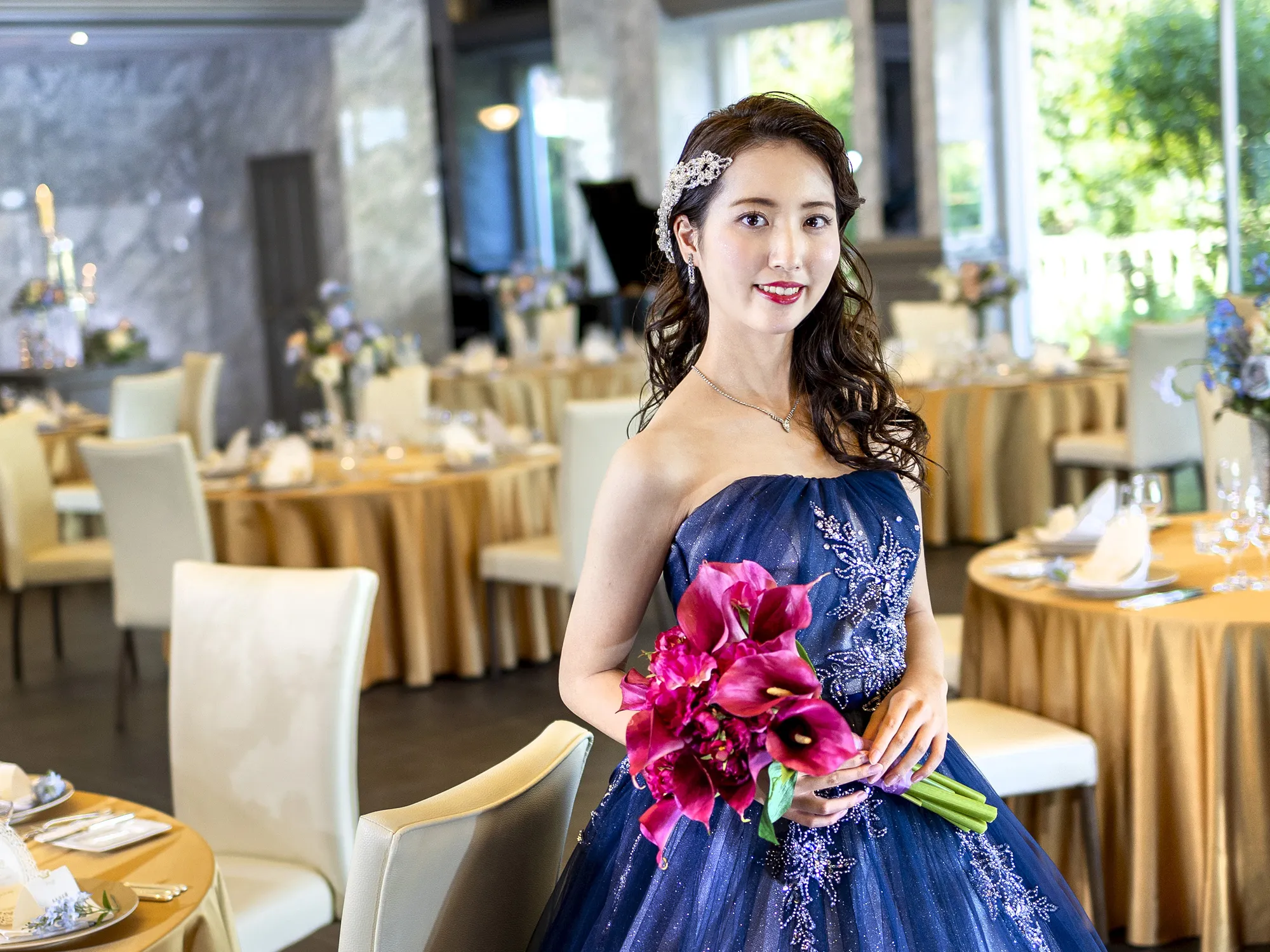 開放感あふれる大きな窓と輝くシャンデリアがパーティに豪華さと彩りを添えます