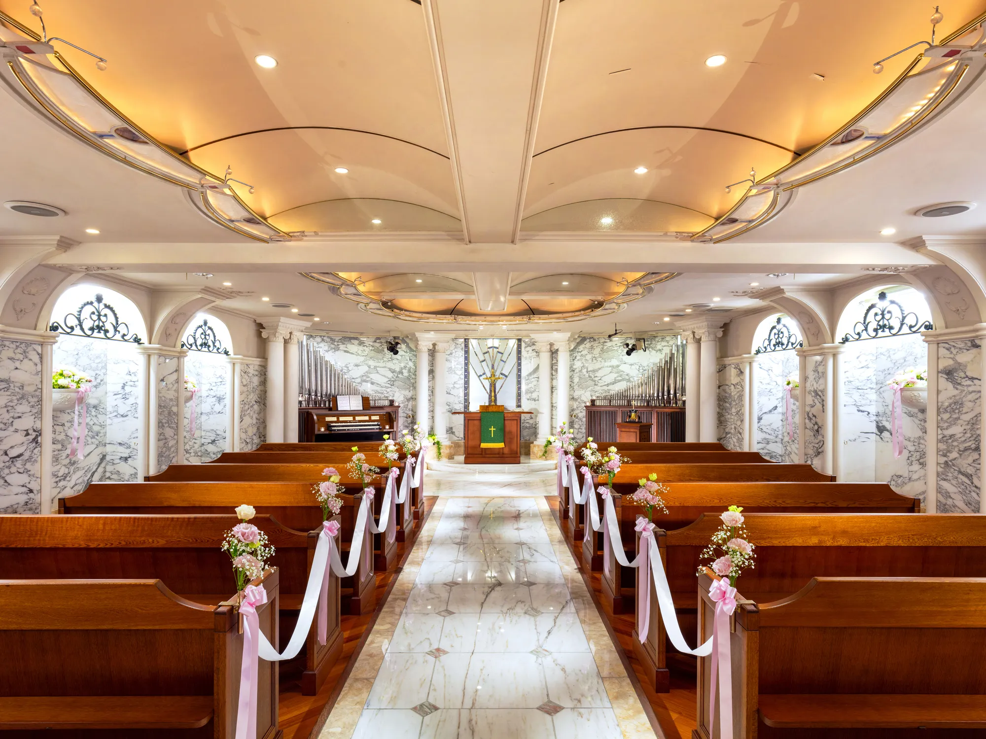 バージンロードや壁画には大理石の中でも最高級品とされるイタリア白大理石を使用